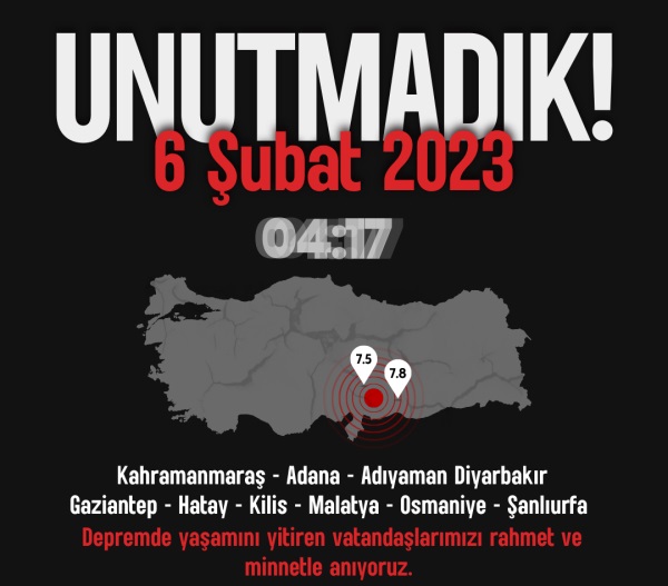 Asrın felaketi olarak hafızalarımıza kazınan 6 Şubat depreminin yıl dönümünde hayatını kaybeden personelimiz ile vatandaşlarımızı rahmetle, saygıyla ve dualarla anıyoruz.