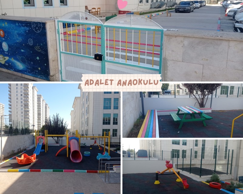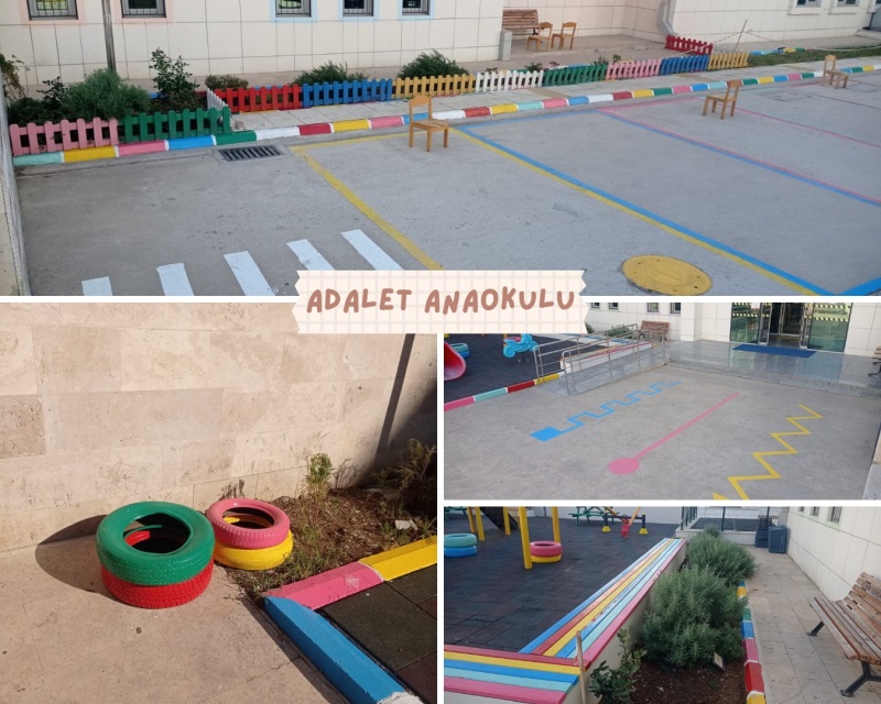 * Adalet Anaokulu bahçesinde dekoratif materyaller boyanmış ve oyun alanı çizgileri yapılmıştır.